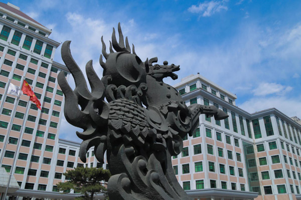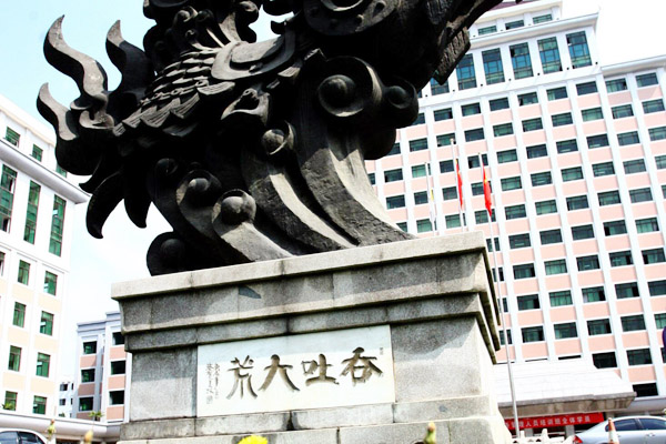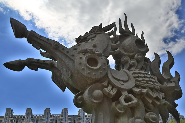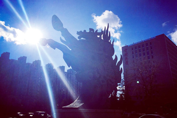 中财标识--龙马担乾坤 2018-03-25关注:次 雕塑造型由龙马和象征乾坤的太极球组成,用青铜铸就,通高9米,称之为“龙马担乾坤”。按照中国传统说法,所谓“龙马精神”即“龙”与“马”有着共同的灵魂,马亦是龙。龙马担乾坤,体现了中华民族顶天立地的气派。中央财经大学金融学院IUP国际本科2+2留学项目校园环境设施;图片素材来源于中央财经大学金融学院国际本科2+2项目官网